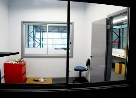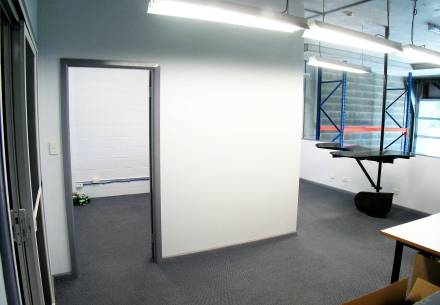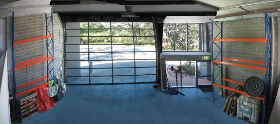 High rise opening glass door. Four level pallet racking both sides on ground floor. Bushland and AM sunshine enjoyed from within building.