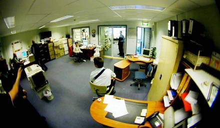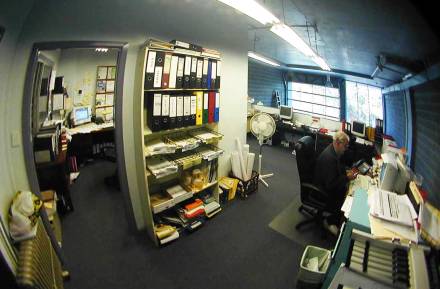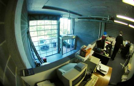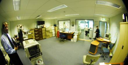 A. Central main office with false ceiling. Glass doors and panels provide views East to bushland.